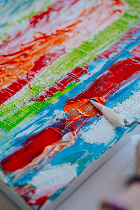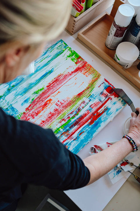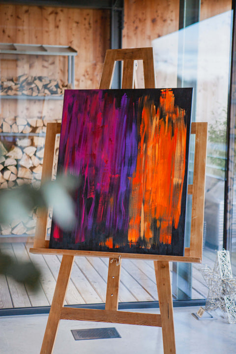 Action Painting ist eine dynamische, unbewusste Maltechnik, um das Innerste auf die Leinwand zu bekommen. Das Experimentieren mit Farben, Linien und Formen sind kennzeichnende Mittel.